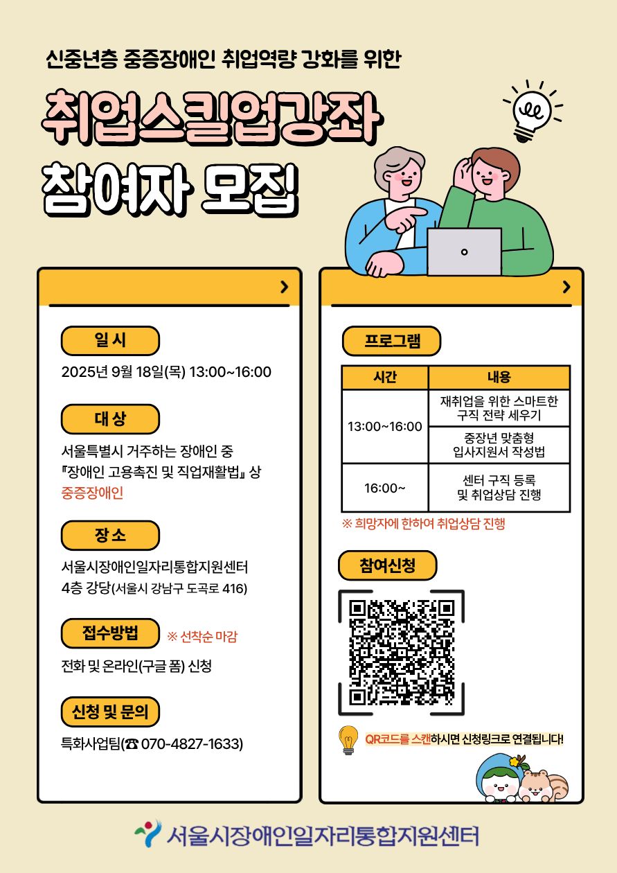 오는 9월 18일 목요일 오후 1시부터 4시까지 서울시 강남구에 위치한 서울시장애인일자리통합지원센터 4층 강당에서 진행되며 , 참가비는 전액 무료다. 이번 3회차 강좌에서는 더쓰임라이프연구소의 이난영 강사가 초빙되어 ▲재취업을 위한 스마트한 구직 전략 세우기 ▲중장년 맞춤형 입사지원서 작성법 등을 주제로 강의할 예정이다. 또한, 희망자에 한해 개별 취업 상담도 진행된다.