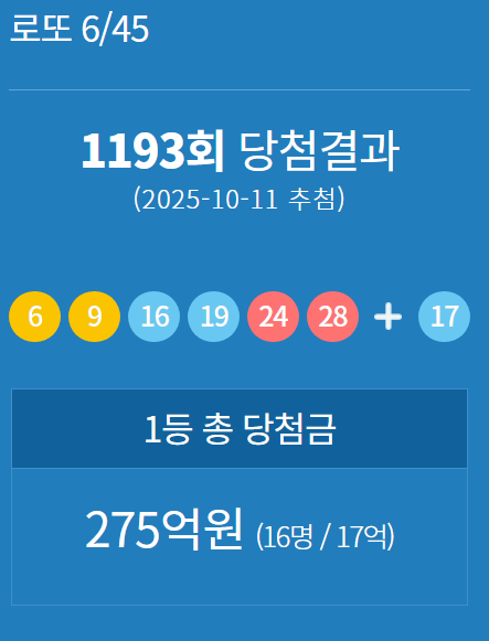 | 1194회 로또 6/45 당첨 번호1등 28명 역대급 당첨 각-10억 (0) | 2025.10.19 |