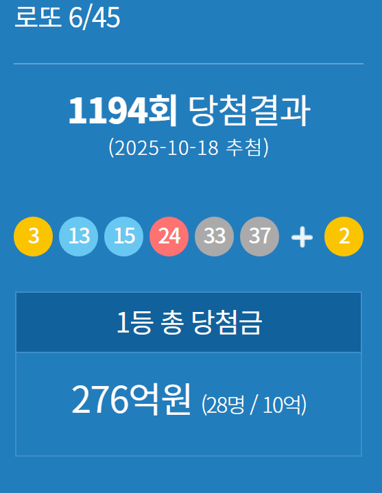 2025년 10월 18일 MBC 추첨에서 1194회 로또 6/45 당첨 번호가 공개됐다. 이번 회차의 당첨 번호는 3, 13, 15, 24, 33, 37번으로, 2등 보너스 번호는 2번으로 결정됐다. 행운의 숫자들이 전국 로또 팬들의 가슴을 설레게 한 가운데, 1등 당첨자는 총 28명으로 집계됐다.