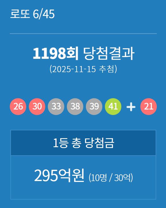 이날 발표된 1등 당첨번호는 **'26, 30, 33, 38, 39, 41'**이다. 2등 보너스 번호는 **'21'**로 결정됐다.