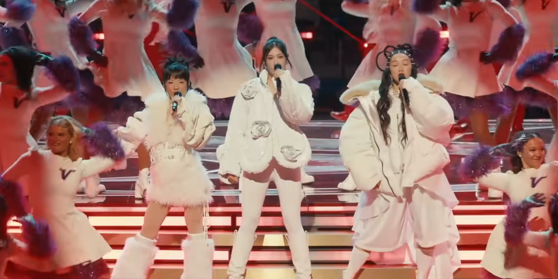"헌터스(HUNTR/X)"는 크리스마스 캐럴 'The 12 Days of Christmas'를 불렀다. 주목할 점은 이들의 역할이다. 단순히 배경 화면에 스쳐 지나가는 병풍이 아니었다. 스눕독은 이들에게 마이크를 넘겼고(Pass the mic), 그들은 레이니 윌슨(Lainey Wilson) 같은 당대 최고의 컨트리 스타들과 동등한 자격으로 'Verse(절)'를 소화했다.