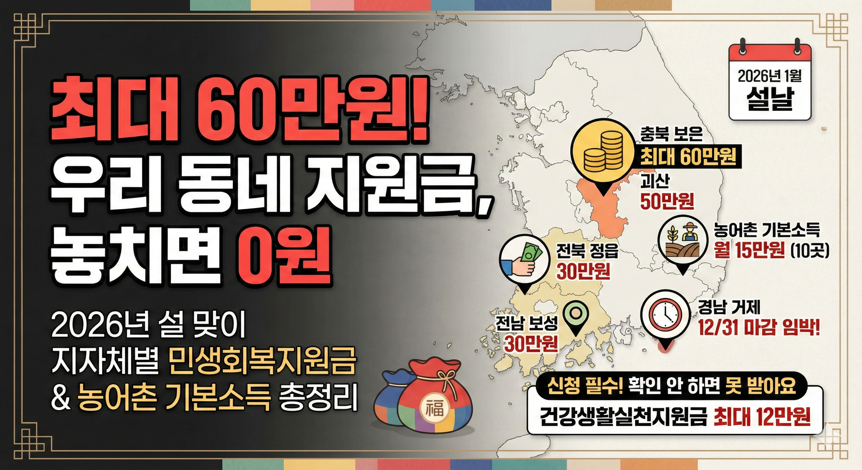 충북 보은군은 군민 1인당 60만 원을 지급한다고 밝혔다. 이는 전국 최고 수준이다. 지급 방식은 1차와 2차로 나뉜다. 내년 1~2월 설 명절 전후로 30만 원을 지급하고, 나머지 30만 원은 가정의 달인 5월 이전에 지급해 상반기 중 총 60만 원을 지원한다 .